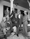 Several outstanding business leaders from the East visited the Stock Show prior to leaving for a trip to the Pitchfork Ranch at Guthrie. Pictured here, standing, left to right, are C. E. Sheehy, vice president in charge of beef operations of Armour & Company, Chicago; J. Gates Williams of St. Louis, president of the Pitchfork Land and Cattle Company, J. D. Breaks, vice president of the Chase National Bank, New York; and D. Burns, manager of the ranch. Sitting, left to right: L. J. Sverdrup, St. Louis, consulting engineer; J. F. Krey, president of the Krey Packing Company, St. Louis; H. H. Corey, Austin, Minnesota, president of George A. Hormel and Company. Published in Fort Worth Star-Telegram morning edition February 2, 1954.