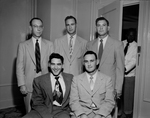 Texas Technological College took top honors in the dairy cattle judging contest for senior agricultural colleges. Members were, rear, left to right, W. H. Cloninger, coach, Elgin Smith and Garland Reese; seated, Jerry Brumlow and Joe Ash. Published in Fort Worth Star-Telegram morning edition February 2, 1954.