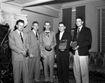 This team from Northwestern State Teachers College won top spot in the general livestock judging contest for junior A&M and teachers colleges. Left to right are Leo Brandt, coach, Corlos Alexander, Don Stout, Dwight Surface and Claude Nickell. Published in Fort Worth Star-Telegram morning edition February 2, 1954.