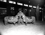 Alex McKenzie, shepherd from Oklahoma A&M College at Stillwater, holds the champion ram, left, and champion ewe, of the Shropshire sheep judging at the Southwestern Exposition and Fat Stock Show. Published in Fort Worth Star-Telegram morning edition February 2, 1954.