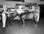 Shoe Stamp, 9-year-old Palomino stallion owned by C. Gordon Arnold of Bedford, was named grand champion at the Southwestern Exposition and Fat Stock Show. Mrs. C. K. S. Russom Jr. of Fort Worth presents the Texas Palomino Exhibitors Association plaque of Jimmy Hobbs handler for Arnold. Reserve champion was Lucky Bob Blanton owned by G. B. Oliver of Alomogordo, N. M. Published in Fort Worth Star-Telegram evening edition February 1, 1954.
