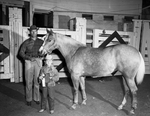 Miss Dapples, owned by C. A. Dawson of Ranger and his 6-year-old daughter, Barbara, right, won the stock mare championship for Palominos at the Southwestern Exposition and Fat Stock Show. Published in Fort Worth Star-Telegram morning edition February 2, 1954.