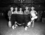 Here's the champion Hereford of the Southwestern Exposition and Fat Stock Show, Perfect Zato Mixer. With the animal, left to right, are George T. Halsell, superintendent of the Hereford division; W. R. Watt, president of the show; Herman R. Purdy of Ohio State University at Columbus, who judged the breeding classes of Herefords; Douglas Gay, Pine Grove, Kentucky, president of the American Hereford Association, and Doug Davis of Loveland, Colorado, owner of the champion bull. Published in Fort Worth Star-Telegram morning edition February 2, 1954.