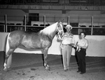 Cliff's Golden Lady, owned by Mr. and Mrs. J. L. Clift and Son of Fort Worth, won the grand championship for Palomino pleasure type mares at the Southwestern Exposition and Fat Stock Show. At left is Clift and right, presenting the trophy, is Mrs. Lyle Cobb of Beaverton, Oregon. Published in Fort Worth Star-Telegram morning edition February 2, 1954.