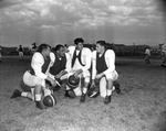 Quartet of hopeful sophomores-to-be who may play prominent part in Texas Christian football next three years are, left to right, Backs Harold Pollard, Henry Crowsey, Charles Curtis and James Swink. Published in Fort Worth Star-Telegram morning edition February 3, 1954.