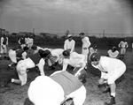 Texas Christian University Backfield Coach Walter Roach, left, standing, gives Ronald Clinkscale instruction on T quarterbacking at start of Texas Christian University's spring football practice. Clinkscale, twice a letterman at halfback, had brief whirl at quarterbacking previously.