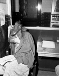 Margaret Priest, the stylish stout temptress, hides her allure from the photographer as appears to post bond on a robbery charge. She is shown sitting and covering her head with her handbag. She was less alert when brought into court two years ago. Published in Fort Worth Star-Telegram morning edition February 3, 1954.