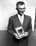High man with 921 out of possible 1,040 points, Robert F. Hendrickson of the University of Wisconsin team, holds plaque he won in the Southwestern Exposition and Fat Stock Show's intercollegiate meat judging contest. He's from Galesville, Wisconsin. Published in Fort Worth Star-Telegram morning edition February 4, 1954.