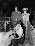 Mrs. T. R. Hinton of the Hinton Sheep Ranch near Keller gives their Hampshire ram, Boots, a final grooming while Mrs. Jane White Price of Mason, and Mrs. Ammie E. Wilson of Plano, left to right, look on. Published in Fort Worth Star-Telegram evening edition February 3, 1954.