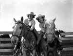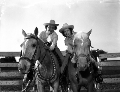 Miss Dorothy Kraft, left and Miss Ellen Kayler registered delight after being declared first place winners in the musical chairs event and open Palomino class, respectively, at the Forest Park Saddle Club's horse show. Published in Fort Worth Star-Telegram morning edition May 15, 1950.