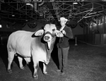 Champion Brahman bull of the Stock Show was JDH Okaloo Cardo Manso 601/6, 1,700-pound 2-year-old shown by the J. D. Hudgins Ranch of Hungerford. LaRue Douglas, Hudgins herdsman, is at the halter. Published in Fort Worth Star-Telegram evening edition February 2, 1954.