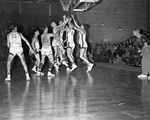 Scrapping for the ball are, left to right, I. B. Childs of Poly, John Claunch (15) of Paschal, Ray Boots of Paschal, Elwin Seay (behind Boots) of Poly, Roy Dunkleberg (6), and Herschell Mitchell of Poly. Paschal won, 44-41. Published in Fort Worth Star-Telegram morning edition February 4, 1954.