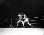 Heavyweight James Hoff, right, mixes it up with Jesse Traughber in finals of Dallas Golden Gloves regional tournament. Hoff was winner and will appear in the state meet, sponsored by the Star-Telegram, at Will Rogers Coliseum starting Feb 17. Published in Fort Worth Star-Telegram evening February 03, 1954.