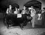 Grand Champion Angus female of the stock show is A. V. Elmaretta, a 2-year-old heifer, shown by Angus Valley Farms of Tulsa. With the animal, left to right, are A. E. Darlow, Angus judge; Frank Richards of Chicago, secretary of the American Angus Association; Ray Hardesty, manager of Angus Valley, and Earl Dugger, Angus Valley herdsman. Published in Fort Worth Star-Telegram morning edition February 4, 1954.