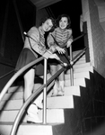 Texas Wesleyan College drum majorettes Sallie Tucker, left, and Libby Forsyth were honored guests on TWC Day at the rodeo. The TWC band played a concert preceding the performance. Published in Fort Worth Star-Telegram evening edition February 4, 1954.