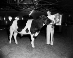Seluhm Home Run, a Holstein junior bull calf is the grand champion Holstein bull of the 1954 stock show. Don Rages, in charge of the show herd of Paul Selken Farms of Smithton, Missouri, poses the bull. Published in Fort Worth Star-Telegram morning edition February 5, 1954.