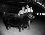 The reserve champion Shorthorn female of the Stock Show was Dora Waterloo, shown by Mathers Brothers of Mason City, III. With the animal are Vernon Benroth, left, Shorthorn judge, and Gene Mathers, who showed the animal. Published in Fort Worth Star-Telegram February 5, 1954.