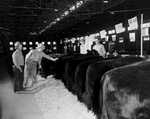 The Swisher County 4-H and Future Farmers of America stall won the junior Herdsmen Award at the Southwestern Exposition and Fat Stock Show. In foreground are Joe Thornton, left, and Johnny Leathers, Tulia vocational agricultural teacher. In background are Don Fincher, left, and Hoyet Burnam. Published in Fort Worth Star-Telegram evening edition February 5, 1954.