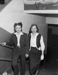 Mrs. Billy Weeks, left, wears a belt buckle her husband won for bronc riding with her tailored riding costume, but Mrs. J. B. Bradshaw, right, prefers a sports outfit complete with white gloves. Both rodeo wives are brides of a year. Published in Fort Worth Star-Telegram evening edition February 5, 1954.