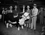 Champion Polled Hereford female of the Southwestern Exposition and Fat Stock Show was EER Victoria tone 50th, left, shown by Double E Hereford Ranch at Senatobia, Mississippi. Pictured, left to right, are R. A. Halbert, president of the American Polled Hereford Association; E. E. Moore Jr. and Early Purdy, both Double E. herdsmen. Published in Fort Worth Star-Telegram morning edition February 3, 1954.