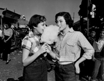 At the Southwestern Exposition and Fat Stock Show, a day was dedicated to children. Here are shown two Polytechnic High School sophomores sharing cotton candy at the rodeo. At left is Rita Kay Stewart of 3959 E. Lancaster. Her friend is Margie Dodson of 3401 Cardinal Ridge. Published in Fort Worth Star-Telegram morning edition February 6, 1954.