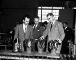 Here it is shown a photo of E. L. Miller, right, manager of the Chicago Pneumatic Tool Company plant, who shows a finished drill bit to Dusan Arandjelovic, one of the engineers, and A. E. Laurencelle, project manager for the Foreign Operations Administration of the U. S. government, sponsors of the trip. Published in Fort Worth Star-Telegram morning edition February 7, 1954.