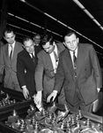 Yugoslav engineers visit the Chicago Pneumatic Tool Company plant here, a sponsored trip by the Foreign Operations Administration of the U.S. government. Engineers Vjekoslav Peros, Dusan Radonicic and Stjepan Kontrec, left to right, examine parts which go into making rock bits at the plant. While here the group also were guests of the Mid-Continent Supply Company. Published in the Fort Worth Star-Telegram on February 7, 1954.