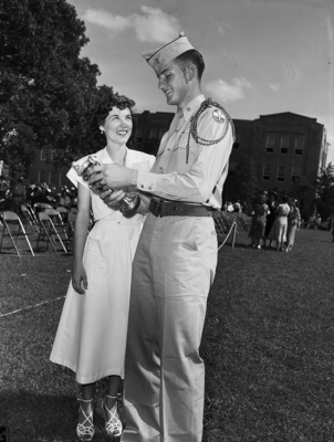 Cadet Major Malcolm D. Bullock of Dallas shows his company's efficiency trophy to an ASC sweetheart, Mary Ann South of Fort Worth. Published in Fort Worth Star-Telegram morning edition May 15, 1950.