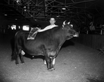 J. R. Gillham of Clarendon is at the halter of Tulpid's Design Bob, named grand champion Jersey bull at the Southwestern Exposition and Fat Stock Show. Published in Fort Worth Star-Telegram morning edition February 6, 1954.