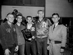 The high team and individual of the grass judging contest are pictured. Left to right, Darrel Witt, Gatesville FFA; high individual; Lowman Gober, Floyd McKinnerney, J. D. Smith, all on winning team, and R. J. Powell, coach of winning team from Richland Springs FFA. Published in Fort Worth Star-Telegram morning edition February 7, 1954.