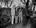 Chatting with Mrs. Bob Benton, president of the Cowtown Posse Auxiliary, at a party honoring the auxiliary and its parent organization are, left to right, Charles E. Hipp of Graham; Ernest Allen, vice president of the 1954 Southwestern Exposition and Fat Stock Show, and E. P. Maddox, Cowtown Posse president. Published in Fort Worth Star-Telegram morning edition February 8, 1954.