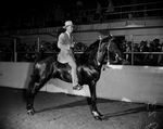 A 4-year-old Tennessee Walking Horse stallion owned by Breese Oil Company of Ankeny, Iowa, won the $500 junior stake for walking horses at the stock show. The rider is Benton King. Published in Fort Worth Star-Telegram morning edition February 8, 1954.
