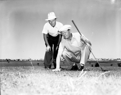 Byron Nelson tests the grass on a new green at Z. Boaz, while Skeet Fincher, pro at Rockwood, looks on. Muny course will be re-opened about June 15. Published in Fort Worth Star-Telegram morning edition May 14, 1950.