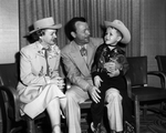 Six-year-old Rix Quinn dressed up in cowboy clothes to see Roy Rogers and Dale Evans and wound up having his picture made with the couple before they went to S. S. Dillow Elementary School to present a safety award to the school. Published in Fort Worth Star-Telegram evening edition February 8, 1954.