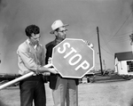 B. L. Jordan, left and John Petroff of the city traffic engineering department mount one of the new red stops which have replaced the old yellow signs at nine busy intersections. If the test signs are successful, said Traffic Engineer Miller, all stop signs will be painted red. Published in Fort Worth Star-Telegram morning edition February 10, 1954.