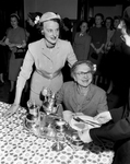 Mrs. P. D. Henry, standing left, president of Alice Carlson P-TA, and Mrs. J. G. Clark, her mother, who was president of E. M. Daggett P-TA when it had the largest membership in the state, presided at the tea service at the Alice Carlson founders day tea at the school. Four life members, Mmes. C. W. Hutchinson and Walter M. Harris, Miss Jessica Lloyd and W. J. Laidlaw were honored. Published in Fort Worth Star-Telegram evening edition February 12, 1954.