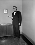 Here it is shown Carl J. Taylor Jr., Houston, who was promoted and transferred to Fort Worth as assistant to Continental Oil Company's southwestern region general manager. He is shown standing next to a cabinet holding a stack of paper in his hand. Published in Fort Worth Star-Telegram morning edition February 14, 1954.