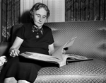 Miss. Lucille Stevens, 1520 W. Terrell, reviews records of First Presbyterian Church which she had compiled during the previous 30 years. She is shown seatead and holding a book. Published in Fort Worth Star-Telegram evening edition February 13, 1954.