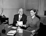 Bruce C. Shulkey, assistant superintendent of elementary schools, and Miss Georgia Fletcher, teacher at Bluebonnet Elementary School, look at an invitation for the 20th Bosses Banquet of Beta Alpha Rho. The banquet was at Glen Garden Country Club. Published in Fort Worth Star-Telegram morning edition February 14, 1954.