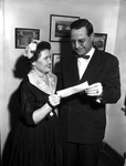 Mrs. Jack Hutcheson, representing the Tarrant County Pharmaceutical Auxiliary, presented $100 check to City-County Hospital Administrator Lowell Hudson for the B'nai B'rith Medicine Fund. Published in Fort Worth Star-Telegram morning edition February 14, 1954.