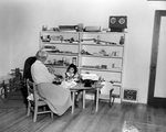 Patients at the Crippled Children's Treatment Center used the center's new facilities. Dr. Mary E. Karraker, executive director, works with 6-year-old Suzanne Marie McDonald, who is partially deaf. She is the daughter of Mr. and Mrs. Jack W. McDonald of 945 Parker. Behind the youngster, are some of the toys stored in the new playroom. Published in Fort Worth Star-Telegram morning edition February 14, 1954.