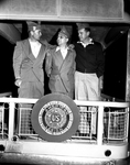 These three members of Fort Worth Voiture 1185, Forty & Eight, huddled on the rear platform of the American Legion organization's newly-acquired sound-equipped bus just before pulling out for the annual state "Box Car Pilgrimage" to Austin. Left to right are Bill Martin, conductor; Joe Matthews, grand lampiste, and Ed McCloskey, correspondent. Published in Fort Worth Star-Telegram morning edition February 14, 1954.