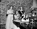 Mrs. O. P Bombarger, center, pours tea for Mrs. Frank G. Trau, right, vice president general of national society, DAR, and Mrs. Homer L. Roper, left, chapter regent, at the 25th anniversary tea of Six Flags Chapter of DAR at St. Ann's Club, 1111 Penn St. Published in Fort Worth Star-Telegram morning edition February 13, 1954.
