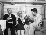 William Paul Hamilton, right, is shown serving coffee to his mother-in-law and father-in-law, Mr. and Mrs. Sanford Tune, who were guests of the Hamiltons at their mobile home. Published in Fort Worth Star-Telegram evening edition February 13, 1954.