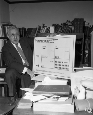 Dr. Elvin M. Jellinek, foremost world authority on alcoholism, discusses a chart showing American drinking patterns of the last century. He was director of Yale Institute for Alcohol Studies in the Southwest, headquartered at Texas Christian University. Published in Fort Worth Star-Telegram evening edition May 19, 1950.