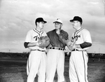 Baseball Coach Walter Roach, center, of TCU ponders problem at first base, where two outstanding sophomores, Walter Roark, left, and Jimmy Mayfield, right, are contending. Published in Fort Worth Star-Telegram evening edition March 3, 1954.