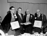 Howard G. Chilton, second from left, presents honorary life memberships in the National Retail Credit Association, and other gifts to Miss Mary Findley of Collins Art Company, W. F. Salt (third from left) of Lone Star Gas Company and H. H. Fox (right) of Stripling's, retired credit managers with more than 25 years of continuous NRCA membership. The three credit executives were honored at the Retail Credit Managers Association dinner at Glen Garden Country Club. Published in Fort Worth Star-Telegram morning edition February 17, 1954.