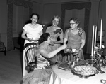 Mrs. D. Ray Lindley serves tea to Mrs. M. E. Sadler at the Texas Christian University (TCU) Faculty Women's Club annual guest day tea Tuesday in Foster Hall on the campus. Looking on are Mrs. Willis Hewatt, left, and Mrs. Henry Hardt, right, who was chairman. Published in Fort Worth Star-Telegram evening edition February 16, 1954.
