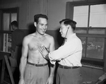 Bruce Price, San Angelo middleweight, gets heart check from Dr. M. O. Isbell prior to opening of Star-Telegram's Texas Golden Gloves meet. Published in Fort Worth Star-Telegram evening February 18, 1954.
