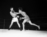 Barefoot Raymond Martinez, right, of Houston slips in hard right to the jaw of Odessa's Leroy Reeves in another flyweight fight at the State Golden Gloves. Despite this damage, Reeves came back to win on a decision. Published in Fort Worth Star-Telegram evening February 18, 1954.